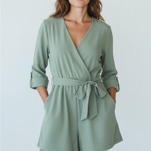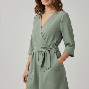 Stylish sage green wrap romper by Zara with a tie waist and pockets. 3/4 sleeves. Stunning. Fast shipping.