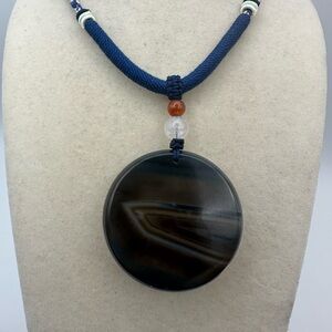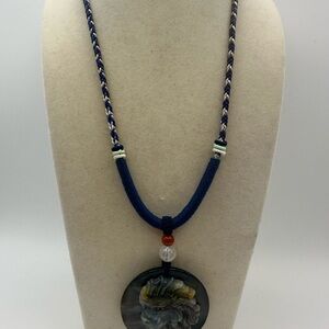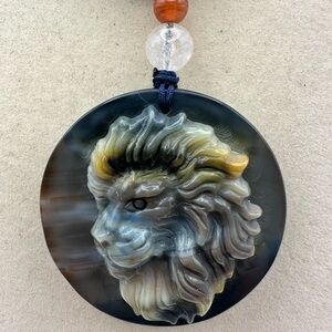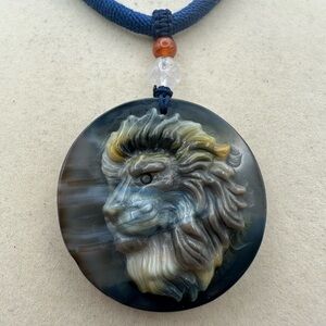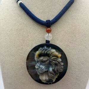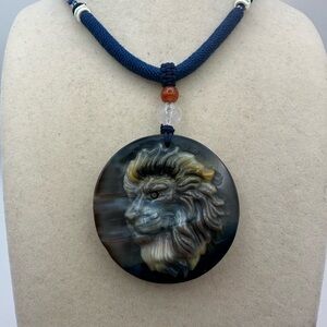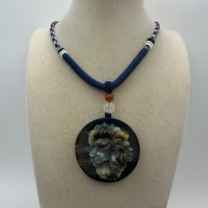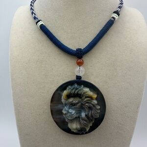 Agate Lion Pendant Necklace with Blue Adjustable Rope Cord