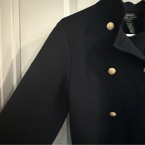 Chic navy wool sweater jacket by Ralph Lauren. Features striking gold buttons. Perfect for a polished preppy, classic look. Excellent condition.