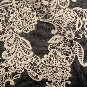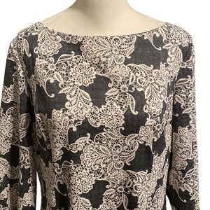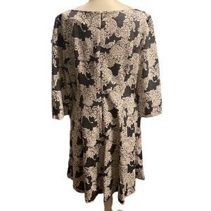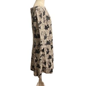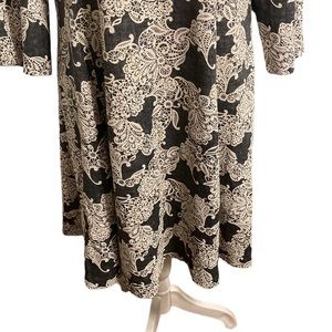 JESSICA HOWARD elegant midi length dress in excellent pre-owned condition. Lace-look textured material. Grey and cream. Full zipper back. Fabric has minimal stretch