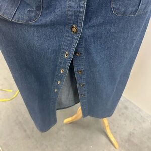 Vintage blue denim dress with a button-down front and multiple pockets. Perfect for casual outings at the beach or at your local honky tonk.