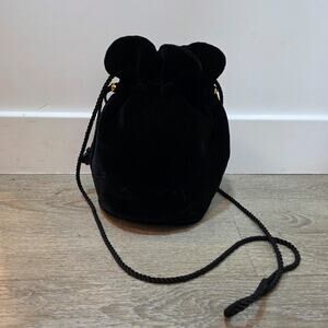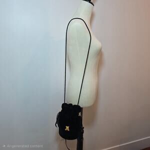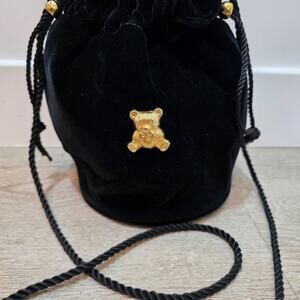 Vintage Black Velvet Bucket Bag Drawstring Gold Teddy Bear Charm Shoulder bag