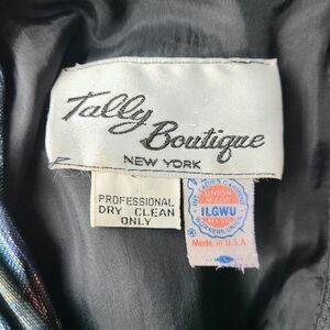 Tally Boutique New York Union Made 80s Vintage Metallic Iridescent Fairy Dress. Features a shirred middle, V-neck, with a middle rosette pin. Major shoulder pads. Back zip with hook and eye closure. Lined with an inside tulle, slightly structured, overlay. 80s glam. No size or material content, fits like a small. Minor areas of age wear, see photos. Given its age, good condition.