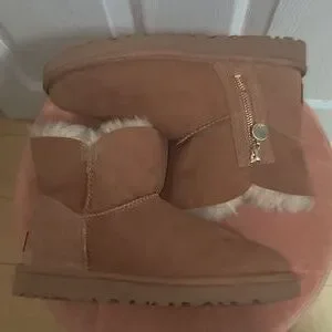 A gleaming side zipper updates a street-ready mini boot pretreated to repel liquids and stains, and lined with genuine shearling and UGGplush for cozy comfort. UGGplush is a moisture-wicking textile made from a wool-rich blend but crafted to feel and wear like genuine shearling.