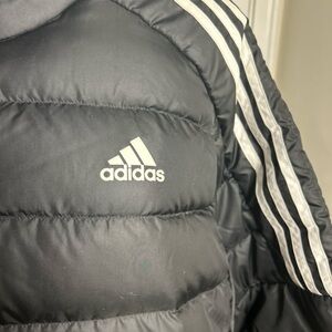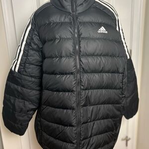Stylish black puffer with signature white stripes. Perfect for winter. Features iconic Adidas logo with white 3 stripe down sleeve.