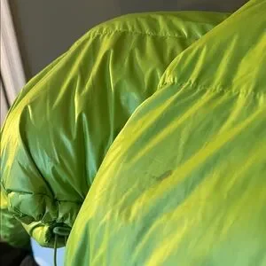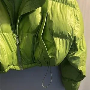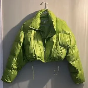 Vibrant lime green puffer jacket with a cropped design. Features a zip closure and a high collar. Drawstring at waist. Small mark on right elbow. See pic.