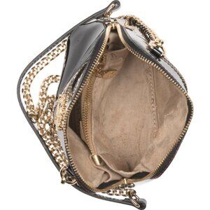 detachable crossbody strap with chain detail, gold tone hardware, tassel zipper pulls