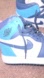 Jordan high-tops with a sleek blue and cream/white design. Authentic, I bought these years ago when I was collecting Jordan’s and I’ve only worn them twice. I had them more as room decor. They also have crease protectors in them that will come with them. They are 6.5Y, I wear about 8.5W and they fit me.