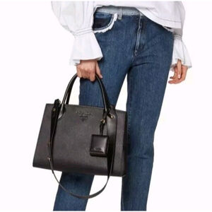 Gently used black medium Prada Saffiano Monochrome tote with removable coin pouch. This inside of this bag is lined with with fabric Prada logo. It has an inside zipper compartment and a slot on the opposite side. Comes with the dust bag and the shoulder strap. The shoulder strap has never been used. The inside is clean with no rips or stains. There is a small thin scratch on the inside leather. There is also a pin size white dot on the back. There is a small scratch in the side but blends in with the bag and not noticeable when the sides are folded in. Pictures of these are included. I do not have the authentication card, I misplaced it, but this bag is 100% authentic. I purchased this at Prada and have been the sole owner. Zipper and shoulder strap accents are gold tone.