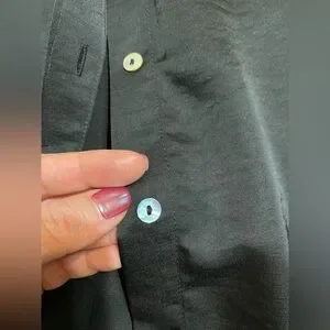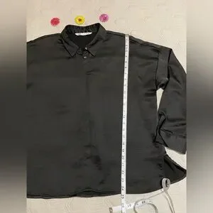 This shirt has a drop shoulder and a loose fit. The satin has a slight texture (as shown in the pictures.)