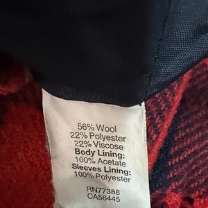 Stylish red and black plaid pea coat. Double-breasted design. Perfect for a chic look. 16.5 pit to pit