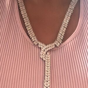 This is a stunning lariat style silver tone necklace covered with sparkling high quality cubic zirconias. This is perfect for the holidays or just to straight out feel fabulous for any occasion.