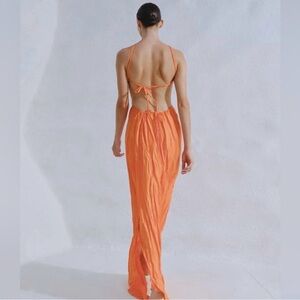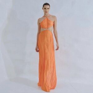 Stunning orange halter maxi dress with cutout design. Perfect for summer events.