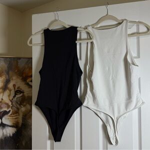 Set of two Babaton by Aritzia sleeveless bodysuits in classic black and white. Made from Babaton’s signature smooth, stretchy contour-style fabric that hugs the body and creates a sleek, flattering fit. Perfect for layering or wearing alone.