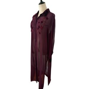 VTG 90s Fashion Bug Burgundy Sheer Duster Embroidered Floral Velvet Collar Size L