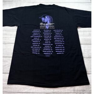 This Vintage Men's Tim McGraw Faith Hill Concert T-Shirt from the 2000 Soul 2 Soul Tour is a black, short sleeve shirt made of cotton material. The shirt features a crew neck and a regular fit, perfect for a classic relaxed look. It is double-sided, with both sides featuring different designs related to music and the 90s theme. The shirt is machine washable and has a Size L. Ideal for fans of the iconic country music couple, this vintage shirt is a unique addition to any collection of music memorabilia.