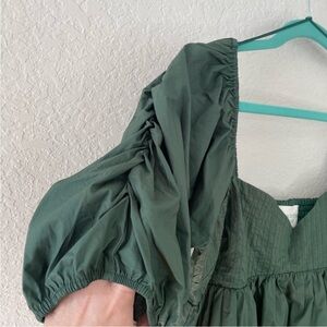 Description: mini dress in a beautiful green with a fluffy skirt, puff sleeves, and sweetheart neckline