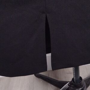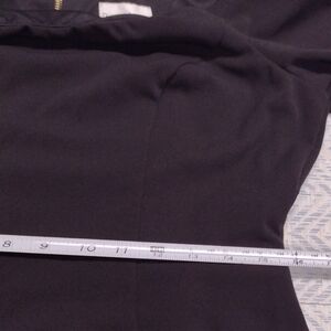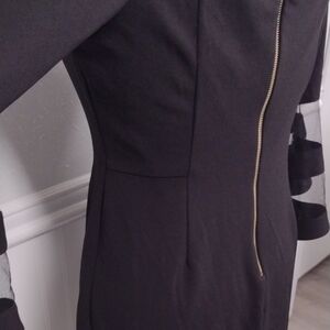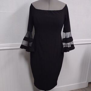 This elegant black dress features stylish sheer accents on the sleeves, perfect for any sophisticated event. Its flattering design ensures a timeless look.