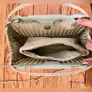 House of Harlow 1960 woven handbag in a soft mint color. Comes with a detachable zippered fabric pouch for easy organization. Bag straps not removable. Gold-tone chain strap and hardware (non leather material)