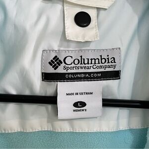 Columbia Arcadia II Rain Jacket Size Large. Aqua Haze (Light Blue-Green) Color. Omni-Tech, Waterproof, Self-packing Rain Jacket. Breathable Mesh Lining. Protective Hood. Drawstrings, Zippered hand pockets. See Materials Tag Photo. See All Photos, Excellent Used Condition.