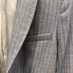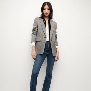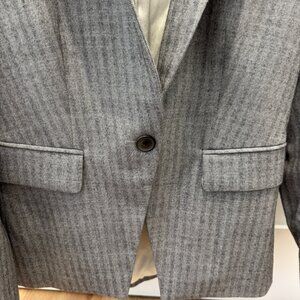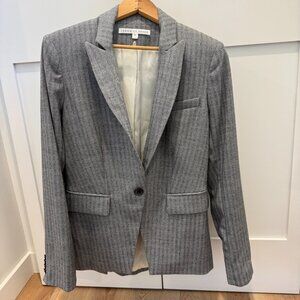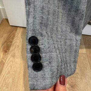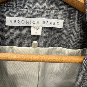 Beautiful Veronica Beard single-button blazer in a classic gray herringbone weave. Size 4. Expertly tailored with a structured fit, notched lapels, front flap pockets, and full lining for a smooth silhouette. Timeless, polished, and perfect for work, meetings, or elevating everyday outfits.