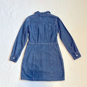 NWT Chic denim shirt dress with button closure. Features chest pockets and collar. Ideal for everyday wear.