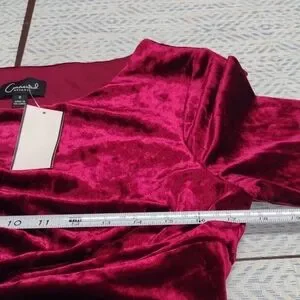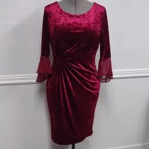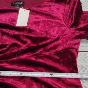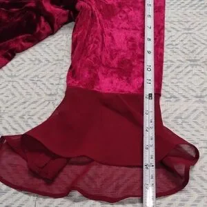 Step out in style with this luxurious velvet dress, featuring elegant long sleeves and a deep red hue. Perfect for any special occasion.