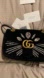 Chic Gucci crossbody bag with crystal embellishments. Features a striking black design. Gold chain strap adds elegance. Length 10” hight 6.25” depth 3” strap drop 11.5" (doubled) or 21" (single)