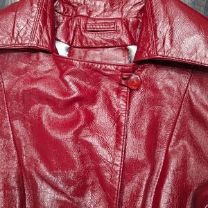 Elevate your style with this stunning red genuine leather coat. Perfect for any occasion, this coat combines elegance and comfort. Great condition. Size 36/small. The vibrant red colour and classic trench coat design make it a standout piece for any wardrobe.