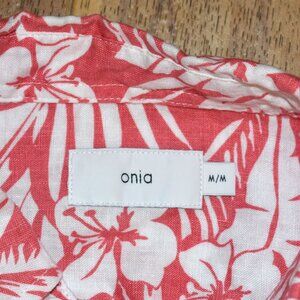 Short sleeve button front linen shirt by Onia. Size Medium and 100% linen. Tropical floral print in orange/white. Rounded bottom hem. In excellent condition with no holes, tears, or stains. Comes from a smoke free home.