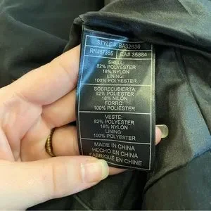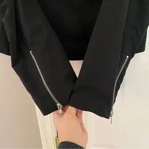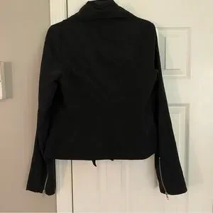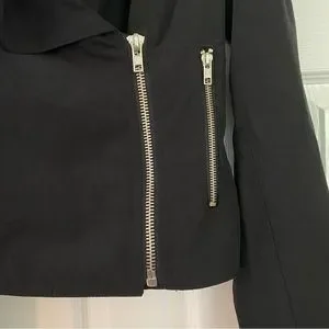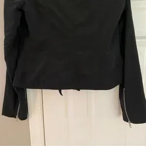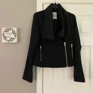 Size medium. Black in color with silver hardware. Zips up half way with draping front. 2 front zipper pockets. Comfortable, stylish jacket.