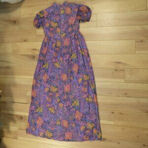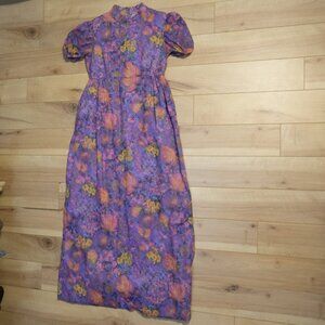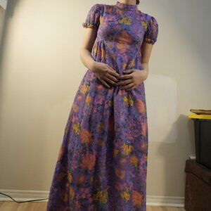 Gorgeous vintage handmade dress reminiscent of the 70s. Short puff sleeves, high neckline, floral exterior, grandma style, empire waist, full ankle-length maxi dress. Shades of purple, pink, and yellow.