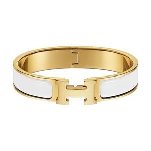 Elegant gold bracelet with white enamel accents. Stylish and versatile.