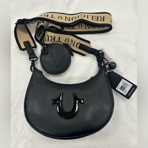 NWT True Religion Black w/Tan Guitar Strap, Coin/Airpod case clipped on Strap