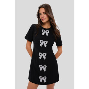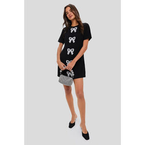 The Beaded Bows Bernadette Mini Dress is the perfect party dress! Featuring beaded bow detailing down the front and a classic silhouette, we chose to pair it with a sparkly clutch and black heels.