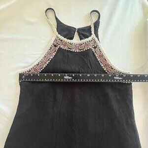 EUC Preowned please review pics to ensure this pretty gauzy texture embroidered neck & shoulder , crochet accented straps with covered button keyhole back flirty hemline Bohemian Festival Hippie chic dress will meet your standards/ requirements.