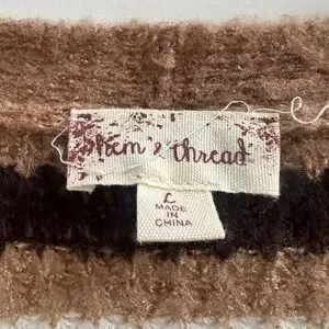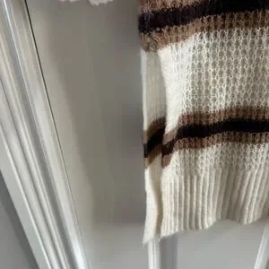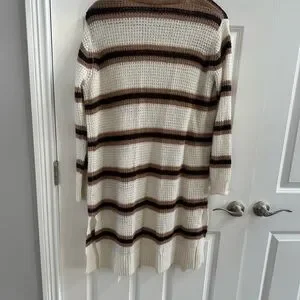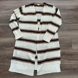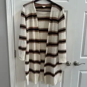 Stay cozy and stylish with this striped open-front cardigan. Featuring a chic blend of cream, brown, and black stripes, this lightweight sweater is perfect for layering. Ideal for casual outings or a relaxed day at home. Excellent condition, size Large. Really cute with leggings or go casual with jeans!