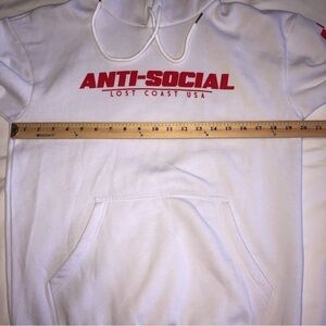 Good pre-loved condition. White hoodie popover kangaroo pocket long sleeves size small. Orange graphic on front says anti-social lost coast USA. Also has orange design on both sleeves. There is a tiny spot on the underside of arm, maybe a pen mark? Super small barely noticeable but wanted to mention. See last picture. See measurements in photos.