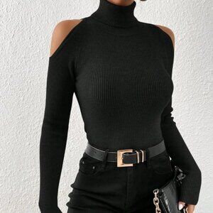 Black Casual Womens Turtleneck Cold Shoulder Ribbed Knit Sweater