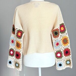 Sincerely Jules Colorful Crochet Granny Squares Bell Sleeve Open Front Cardigan Sweater Size S / Waffle knit, crocheted sleeves. 100% Acrylic/ Machine wash.