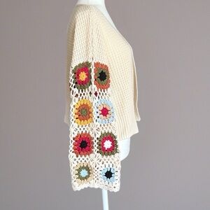 Boho Crochet Granny Square Sleeve Cardigan Cream Open Knit Sweater Size Small