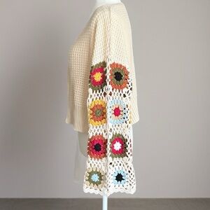 Tags: crochet granny square cardigan, crochet sleeve cardigan, boho knit sweater, vintage crochet cardigan, cream open front sweater, festival cardigan, bohemian cardigan, handmade crochet sweater, 70s style crochet cardigan, granny square fashion, colorful sleeve cardigan, patchwork crochet cardigan, aesthetic cottagecore sweater, knit boho layering piece, retro hippie cardigan