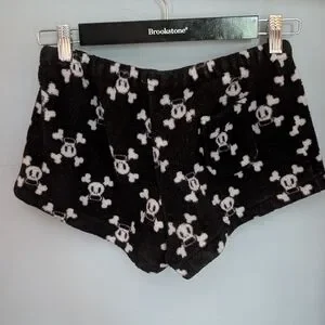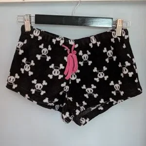 Cozy black shorts with white skull pattern. Pink drawstring adds a pop of color. Perfect for lounging or workouts.