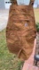 Durable tan short overalls with adjustable straps. Features a front pocket with logo patch.