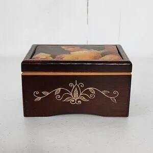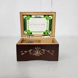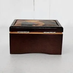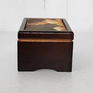 VTG: Lovely, cherry wood finish hinged trinket box with the famous painting image of "A Young Girl Reading" by J. H. Fragonard on silk cushion/gold tone trim accents/wind up mechanism/18 note movement plays- "The Way We Were" made in Fuji Japan by Linden. Rare collectible box circa 1950s. In excellent preloved condition with working hardware/intact structure/original labels. **Disclosure: there are scuff marks/small nicks on the exterior edges. Please see pictures.