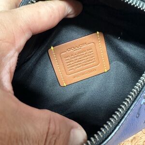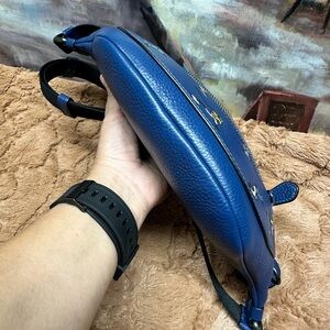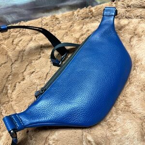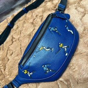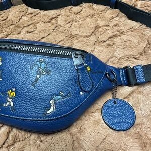 Stylish blue leather belt bag featuring a sports motif. Perfect for casual outings.