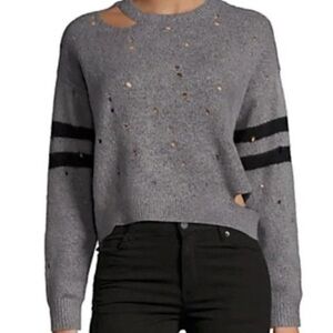 Embrace a modern edge with this Topshop sweater, featuring a gray base with black distressed details and stripe accents on the sleeves. The cropped length and crew neckline offer a trendy silhouette, perfect for casual outings. Beautiful preowned condition. Smoke/pet free home. Open to reasonable offers and bundles.