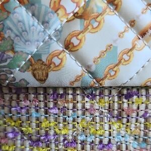 Brighten your wardrobe with this tweed and satin shoulder bag fashioned with an adjustable chain strap for instant versatility.