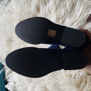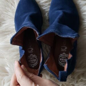 these Jeffrey Campbell women's blue leather ankle booties are a size 36.5. the model name is oriley cutout ankle boot. the stock photos are meant to show the fit and the ones being sold are a blue leather. the heel on these jeffrey campbell ankle boots is 1.5"