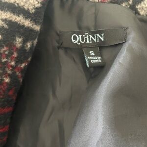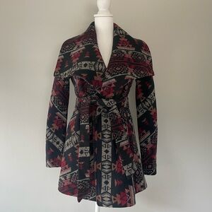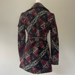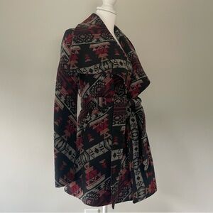 Quinn Patterned Heavy Wrap Jacket in Women’s size Small. Chest measures 17” flat, back shoulder to shoulder measures 15” across. Belted wrap jacket with red, gray, navy, and black Aztec pattern. Approximate length 27”. Mid-weight. Can be worn belted or opened, does not have button closure.